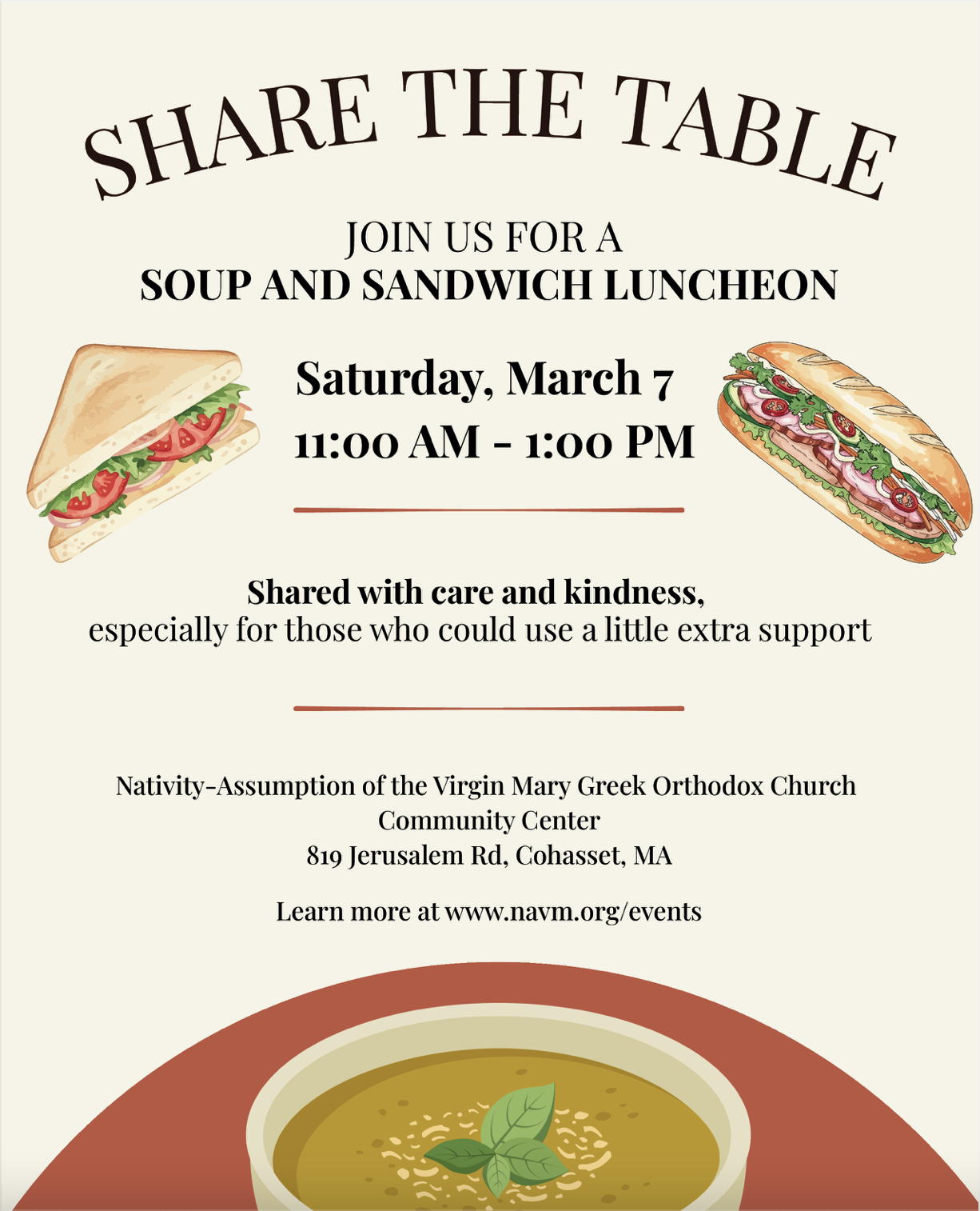Join us for a free Community Sit Down Lunch on Saturday, March 7, 2026 from 11am - 1 pm. it will be a time to share a meal and conversation in our newly built Community Center.